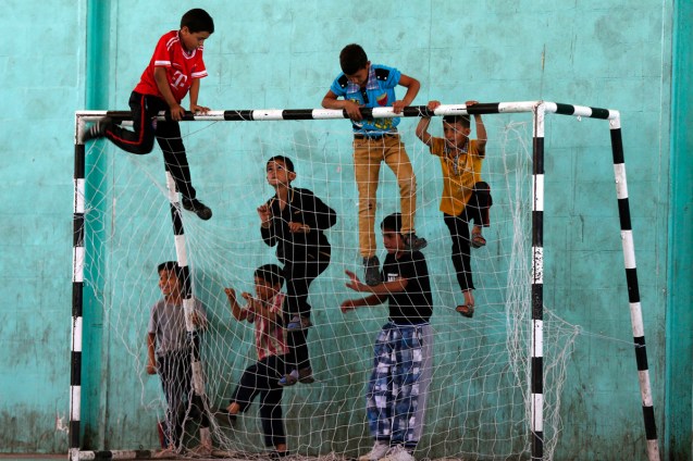 Crianças sírias e palestinianas sobem a uma baliza, antes de um jogo organizado pela Oxfam, no campo de refugiados de Al-Baqaa, próximo de Amã, na Jordânia, em 17 Junho de 2014