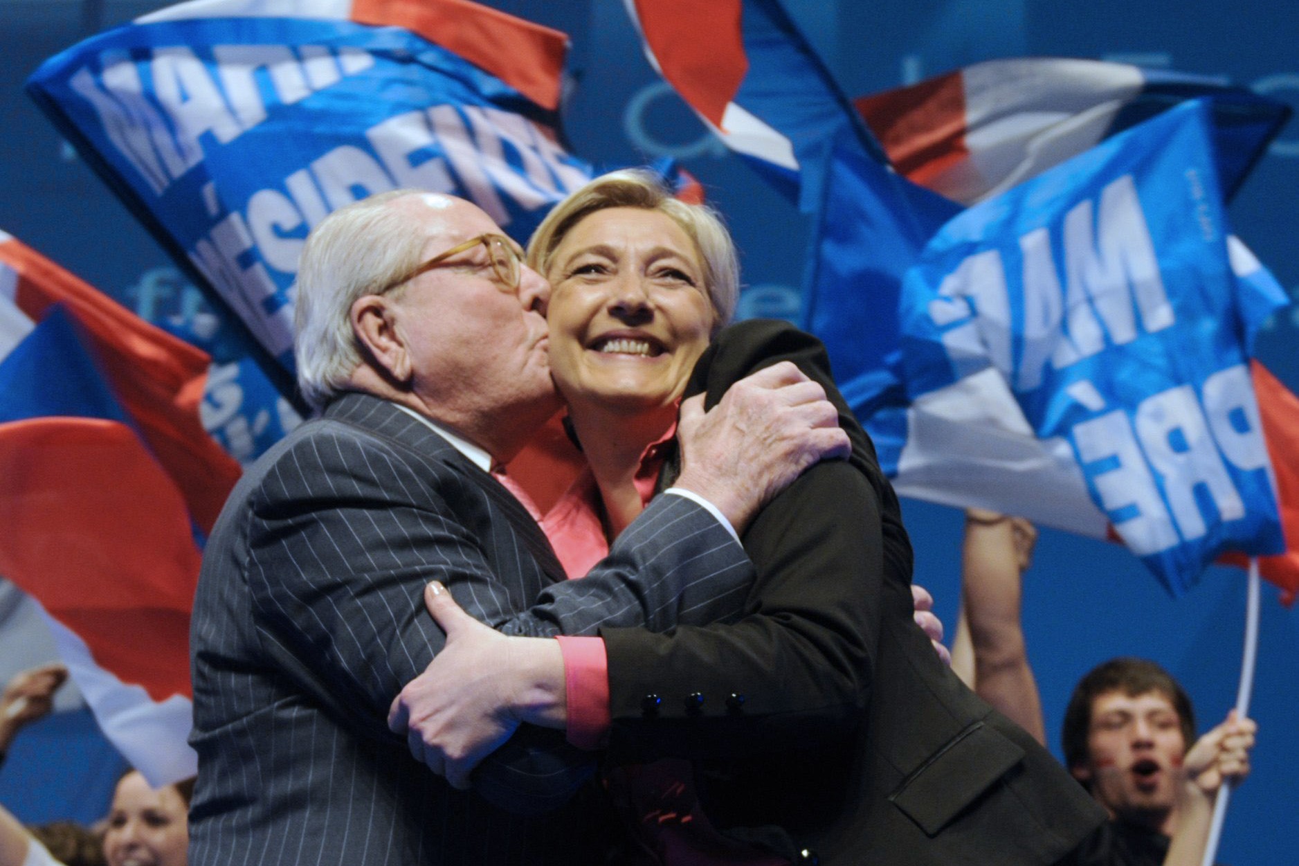 Jean-Marie Le Pen felicita a filha depois da primeira volta das presidenciais de 2012 – obteve então 17,9% dos votos Ela expulsaria o pai da direcção da FN em 2015. Um tribunal reconheceu-lhe o direito de ser, pelo menos, “presidente honorário”