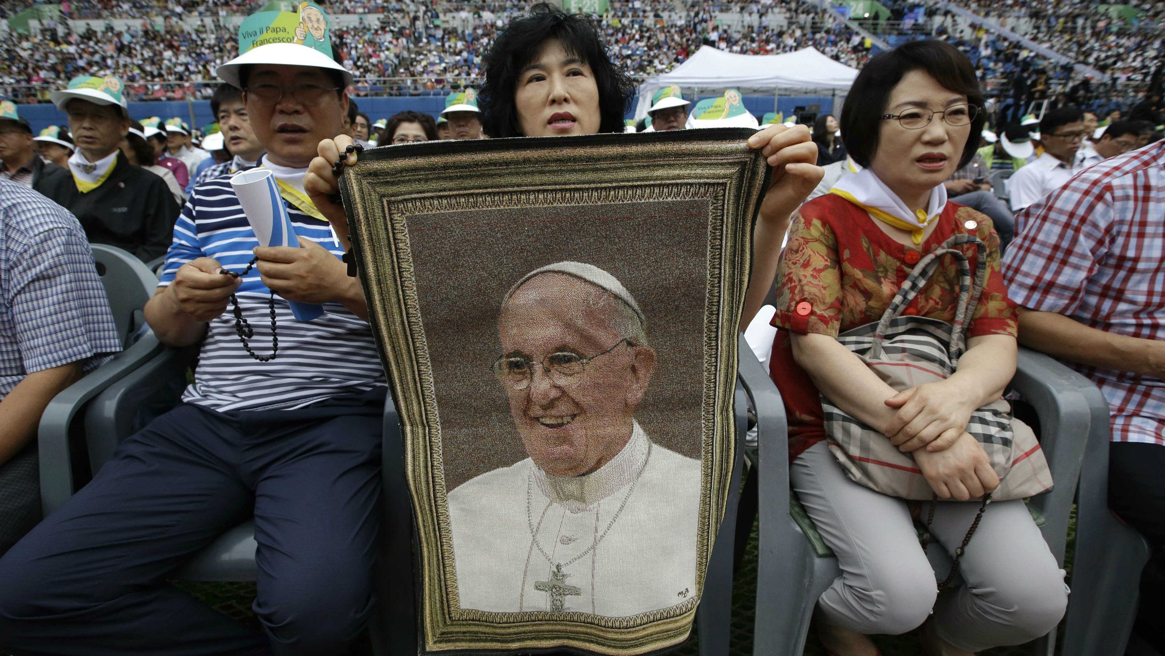 Sul-coreanos festejam a visitam do Papa Francisco em 2014; uma das primeiras visitas do Presidente Moon Jae-in após a sua eleição, em 2017, foi ao Vaticano