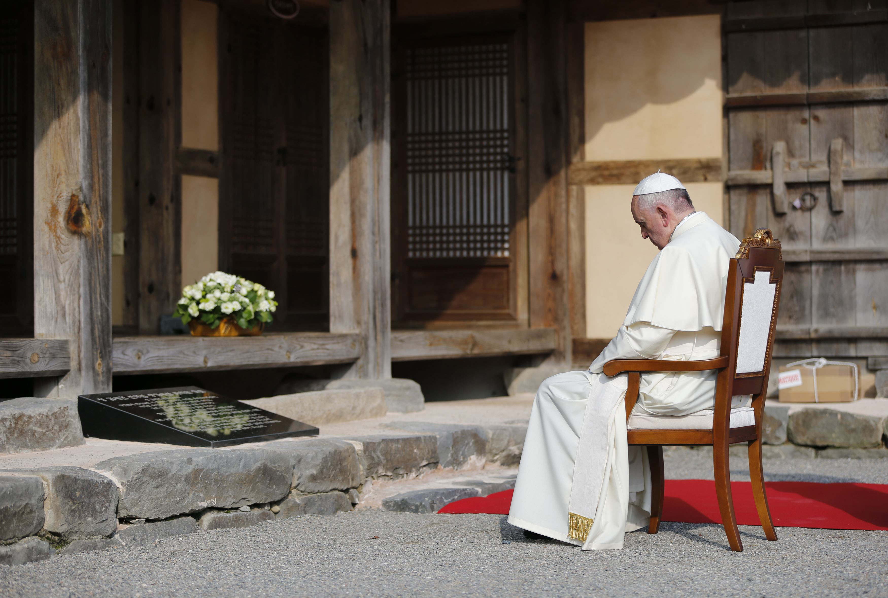O Papa Francisco presta homenagem a Santo André Kim, na terra onde este nasceu, durante a sua visita à Coreia do Sul, em 15 de Agosto de 2014