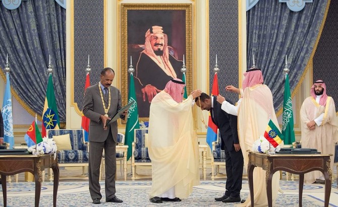 O presidente da Eritreia, Isaias Afwerki, e o primeiro-ministro da Etiópia, Abiy Ahmed, são acolhidos, em Jidá, com todas as honras pelo Rei Salman da Arábia Saudita – país que foi fundamental para que a paz fosse assinada