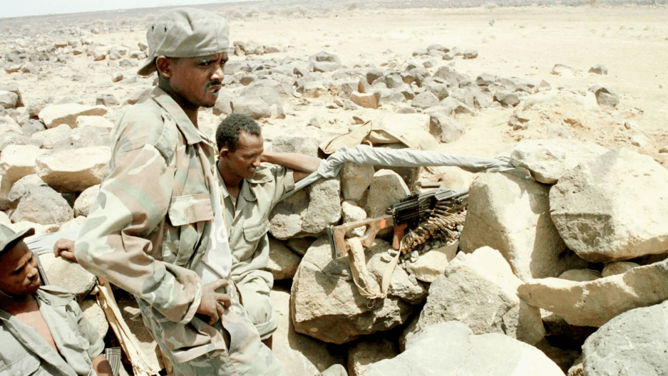 Soldados eritreus de vigia numa nova linha de defesa na frente de Bure, em 30 Maio de 2000, próxima do porto de Assab, no Mar Vermelho – a fronteira foi finalmente reaberta em 2018