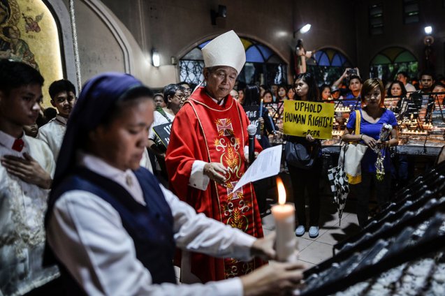 Numa igreja em Manila, o bispo católico Broderick Pabillo lidera uma vigília pelas vítimas das execuções extrajudiciais ordenadas por Duterte