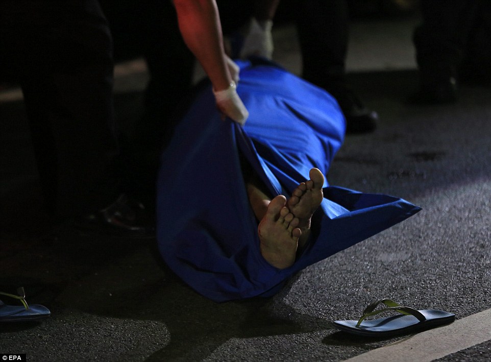 Um funcionário de uma agência funerária cobre o corpo de um homem morto durante uma operação policial contra as drogas em Pasai City, a sul de Manila