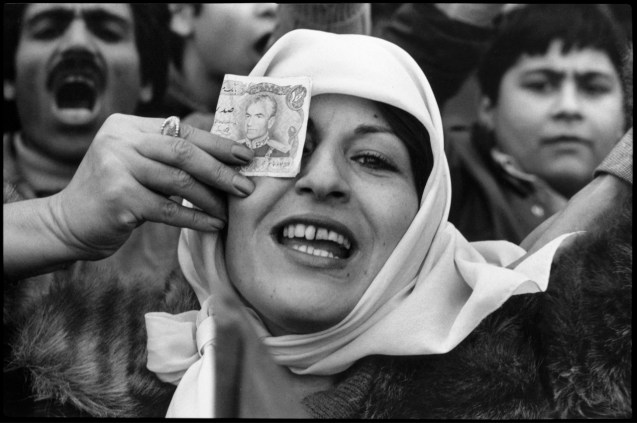 Teerão, 1979: Numa manifestação a favor do Xá Mohammad Reza Pahlavi, no Estádio Amjadiyeh, uma apoiante exibe uma nota com a foto do deposto imperador
