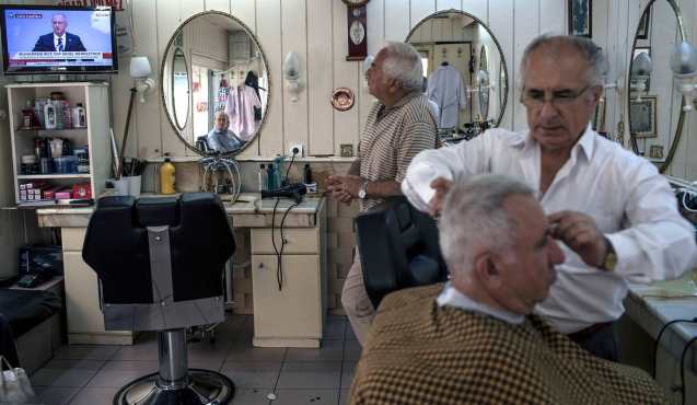 Numa barbearia em Istambul, clientes vêem e ouvem na televisão Muharrem Ince, o líder do CHP que escolheu Ekrem Imamoglu para ser o candidato do partido kemalista à cidade onde Erdogan iniciou a sua carreira política e que tem sido um bastião do islamista AKP, no poder