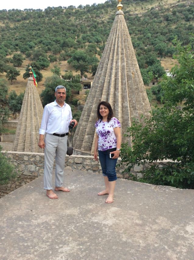 Dunya Mikhail e Abdullah Shrem, o apicultor de Sinjar no templo yazidi de Lalish, no Iraque