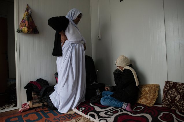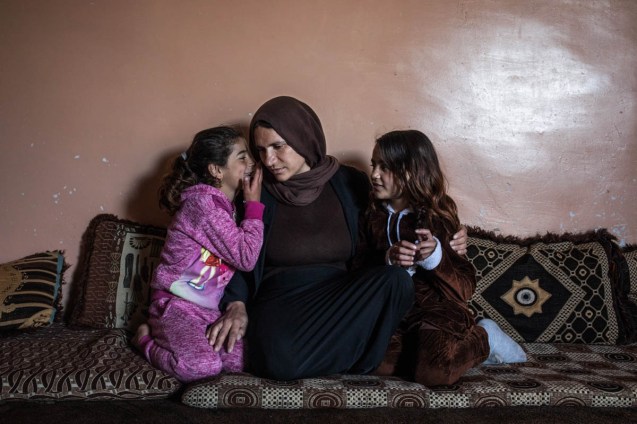 Aisha, uma jovem yazidi com as suas duas filhas, Jinan e Jihan, na casa da família em Sinjar. As duas meninas foram raptadas pelo Daesh e mãe foi escravizada. Em 2018, as três regressaram ao Curdistão iraquiano, resgatadas na Síria em duas operações distintas