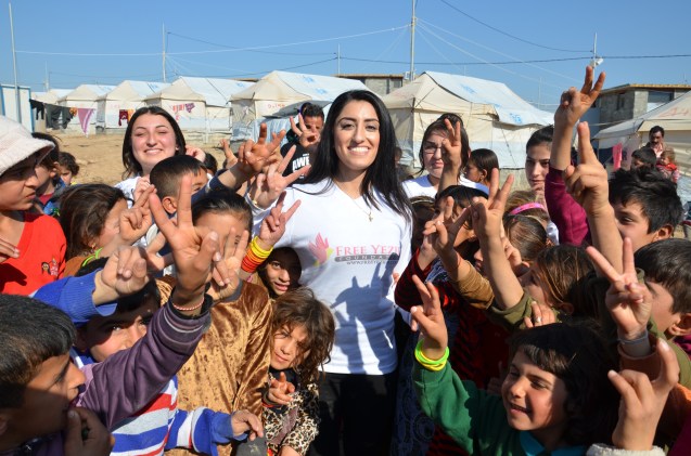 Pari Ibrahim, fundadora e directora executiva da Free Yezidi Foundation, com crianças do campo de refugiados de Khanke, no Curdistão iraquiano