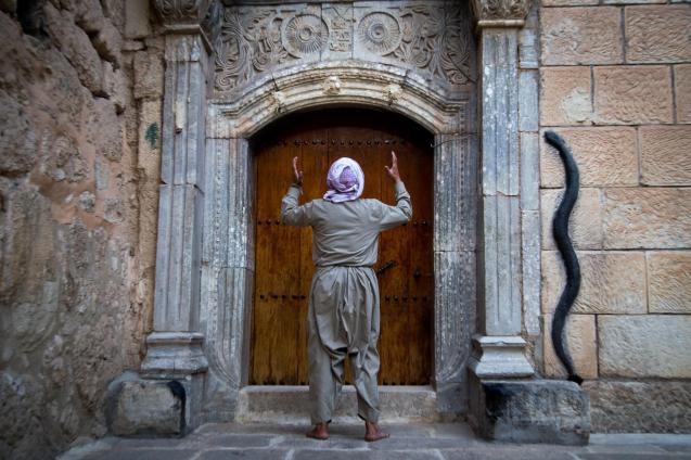 Um homem reza à porta do mais sagrado tempo yazidi – o túmulo do Sheikh Adi – em Lalish, no norte do Iraque