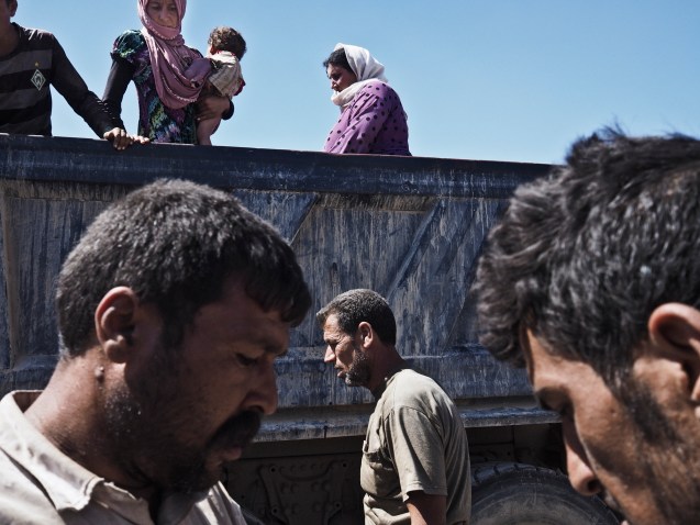 Famílias yazidis provenientes de Sinjar chegam ao posto fronteiriço de Fishkhabur, entre a região curda de Dohuk, no Iraque, e a Síria, em 10 de Agosto de 2014. Foram milhares as que fugiram das suas aldeias e procuraram refúgio nas áreas controladas por forças curdas depois de uma ofensiva do Daesh
