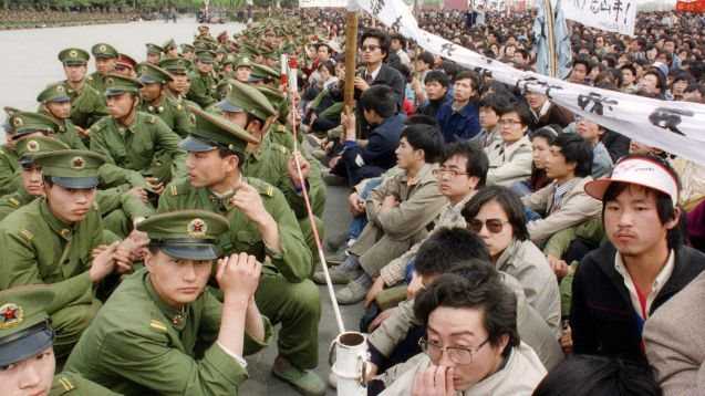Estudantes chineses pró-democracia face a face com agentes da polícia durante as cerimónias fúnebres do reformista Hu Yaobang, em Abril de 1989 – os seus protestos seriam esmagados seis semanas depois no massacre de Tiananmen