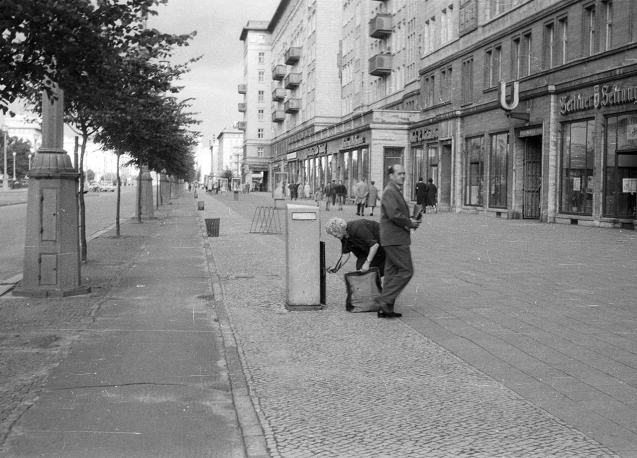 1961: Uma funcionária dos correios recolhe a correspondência em Karl-Marx-Allee. Caixas postais públicas como esta eram um dos locais favoritos da polícia secreta comunista, que furtivamente aqui tirava fotografias para controlar o que era enviado e para quem