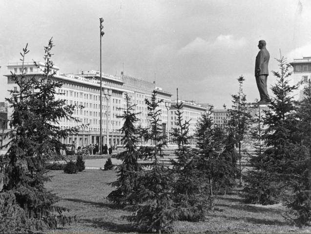 Berlim 1958: Uma estátua de Estaline, em bronze e com 5 metros de altura, nua rua que então se chamava Stalinallee (agora Karl-Marx-Allee). No âmbito de uma campanha de desestalinização soviética, a estátua foi removida e quebrada em pedaços durante uma operação furtiva pelas autoridades comunistas da RDA em 1961. Uma orelha do ditador foi escondida e agora está em exibição num café nas imediações