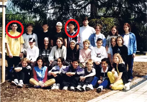 O português João Micaelo (à esquerda) e Kim Jong-un (ao centro), numa foto da escola que ambos frequentavam na Suíça