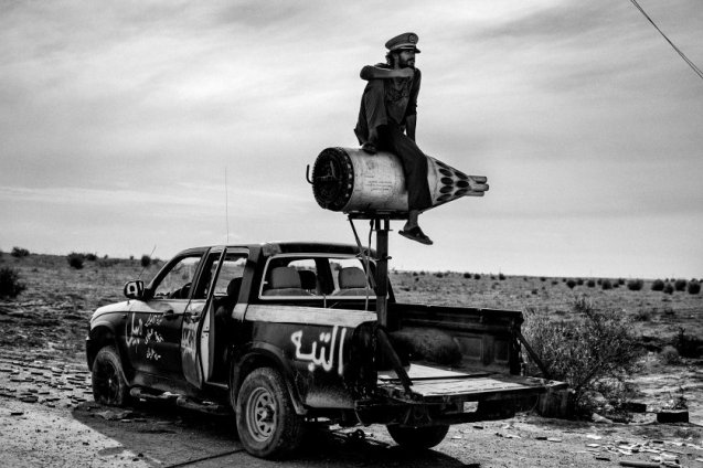 Um rebelde líbio no topo de um rocket montado sobre uma carrinha no deserto próximo de Sirte, a terra-natal de Kadhafi, em 6 de Outubro de 2011