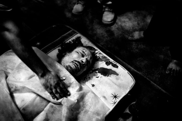 20 Outubro: Com apoio aéreo da NATO, Kadhafi é capturado e morto à queima-roupa por rebeldes, quando tenta fugir de Sirte, a cidade-natal onde se refugiara em 18 de Agosto. O seu corpo fica exposto numa câmara frigorífica durante vários dias. Os líbios fazem fila sob um sol tórrido para um último e macabro adeus ao homem que os oprimiu. Ao abrigo da lei internacional, este assassínio é um crime de guerra;