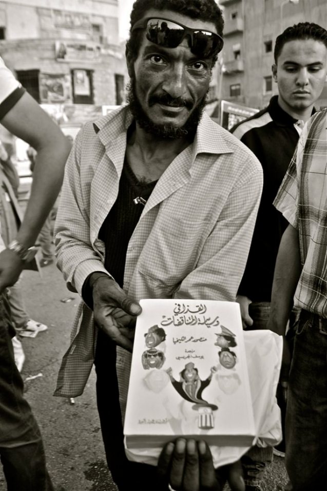 Um homem exibe um livro anteriormente censurado por ser crítico do tirano derrubado e assassinado em 2011: A Líbia de Kadhafi: A política da contradição