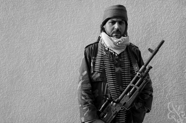 Um estudante de Medicina que aderiu à revolução contra Kadhafi posa para um retrato junto uma estação de rádio dos rebeldes, em Al Bayda