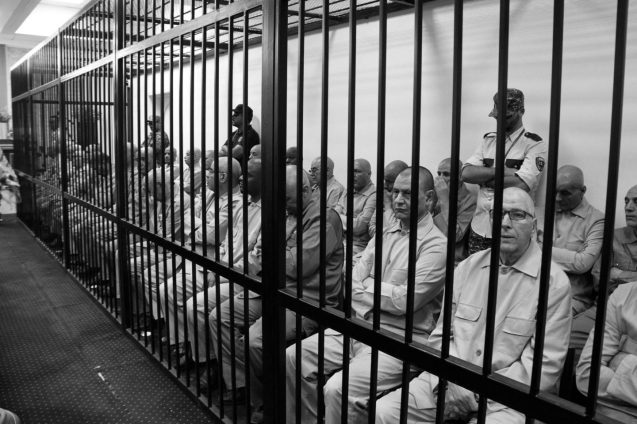 Antigos responsáveis do regime de Kadhafi aguardam o seu julgamento, sentados numa “jaula” em 28 de Julho de 2015