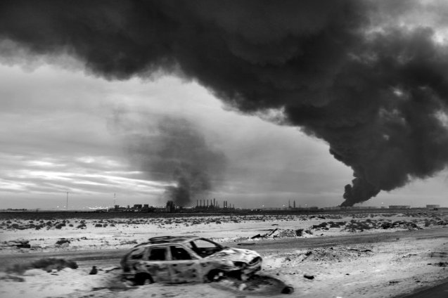 Um veículo carbonizado e abandonado numa estrada que liga a povoação de Bin Jawwad à refinaria de Ras Lanuf, no Leste da Líbia, sob controlo das forças de Khalifa Haftar