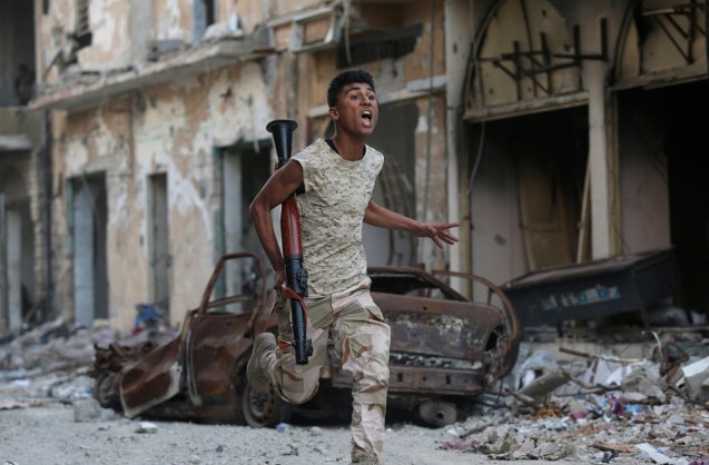 Combatentes das forças do Governo do Acordo Nacional, (GAN), um dos dois executivos líbios, com sede em Trípoli e o único reconhecido pela ONU, celebram a sua vitória sobre os combatentes de Khalifa Haftar, no Leste, ao reconquistarem o bastião de Taruna