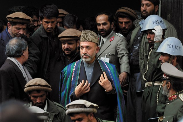 2004: Em 26 de Janeiro, Karzai ratifica a nova Constituição do Afeganistão, redigida e aprovada por uma assembleia de 502 delegados, com o objectivo de criar um forte sistema presidencial que una os 14 grupos étnicos do país. Em 9 de Outubro, Karzai, um dos 18 candidatos, vence as primeiras presidenciais directas da história afegã ––, com 55,4% dos votos, apesar das acusações de fraude.