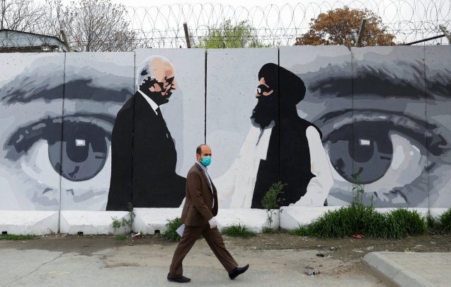 Um mural evocativo da assinatura de um “acordo de paz” entre o enviado americano, Zalmay Khalilzad, e o líder os Talibã, Mullah Abdul Ghani Baradar – a violência continua no Afeganistão acompanhada de um novo inimigo: a COVID-19